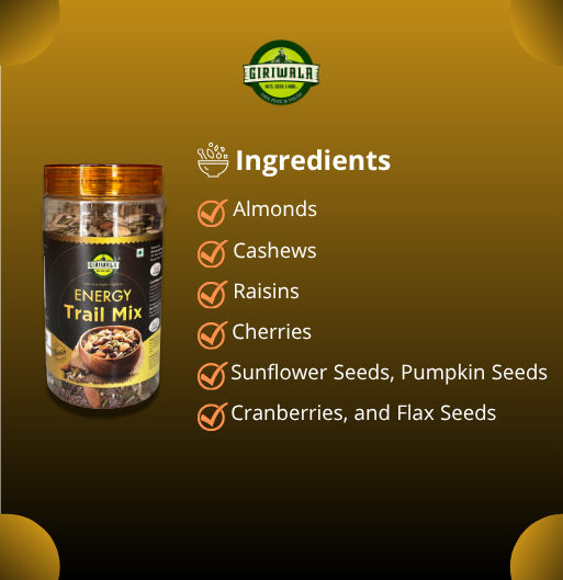 ENERGY TRAIL MIX from Giriwala Nut House is carefully sourced dried fruit and nut product processed under strict quality standards. Handpicked from trusted sources and hygienically processed, this product is ideal for everyday snacking, cooking, and healthy living.