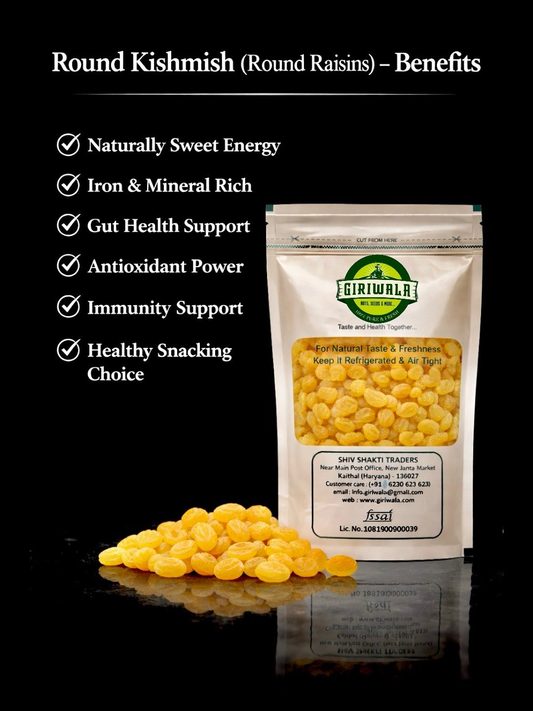 RAISINS GOLDEN ROUND from Giriwala Nut House is naturally sun-dried raisins that are plump, juicy, and full of sweetness. Handpicked from trusted sources and hygienically processed, this product is ideal for everyday snacking, cooking, and healthy living.